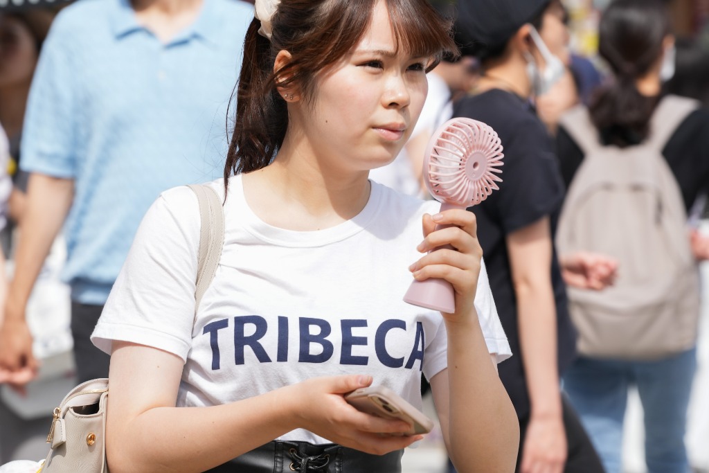 6月29日,一名手持便携风扇的女子走在日本东京涩谷街头。新华社记者张笑宇摄